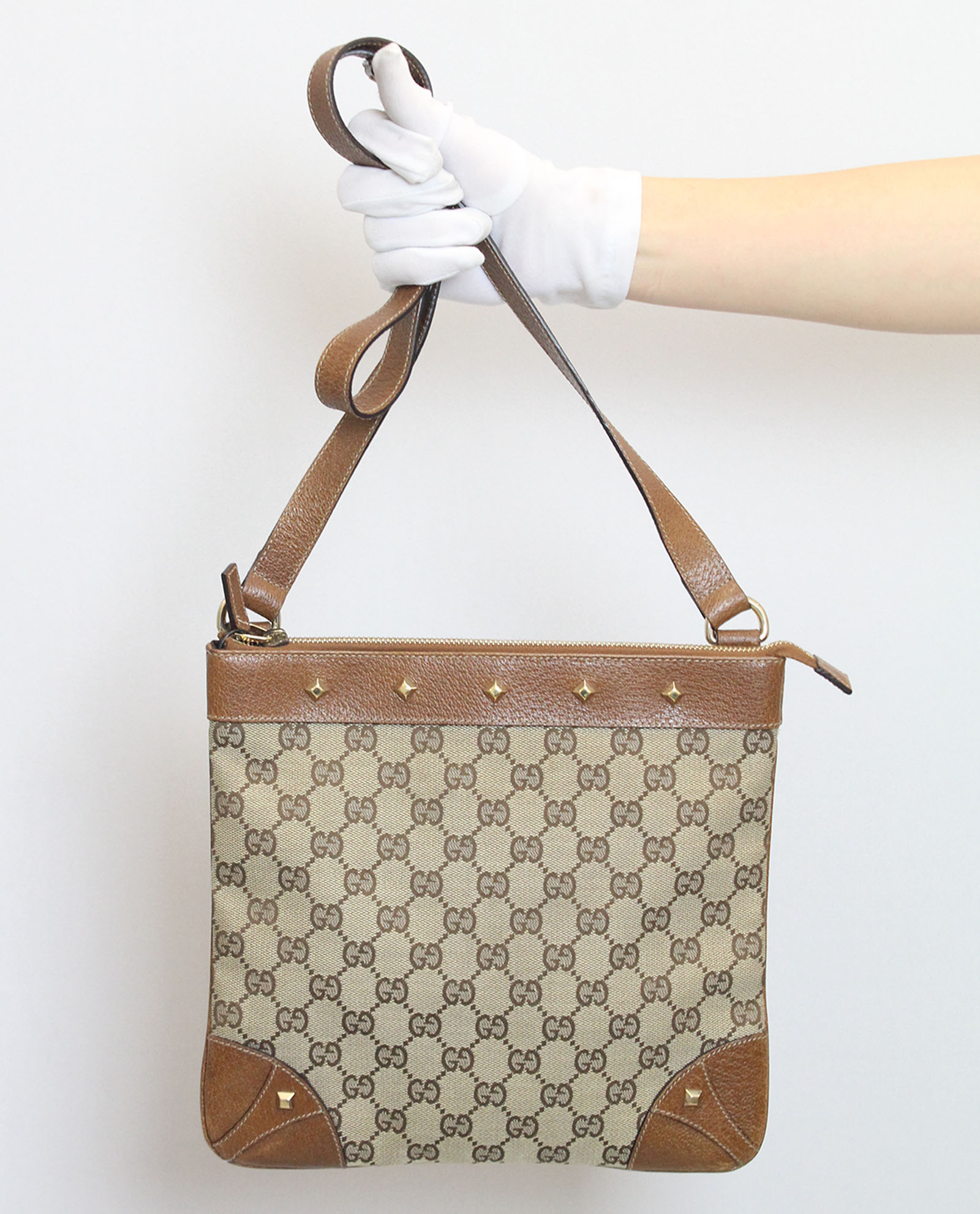 Este bolso de la firma italiana Gucci está elaborado en lona en color beige con estampado de Gucci y con piezas metálicas en dorado. Su tamaño es mediano y su estilo es bandolera. Es ideal para el día a dia. Sus medidas son 25x23x2 cm.