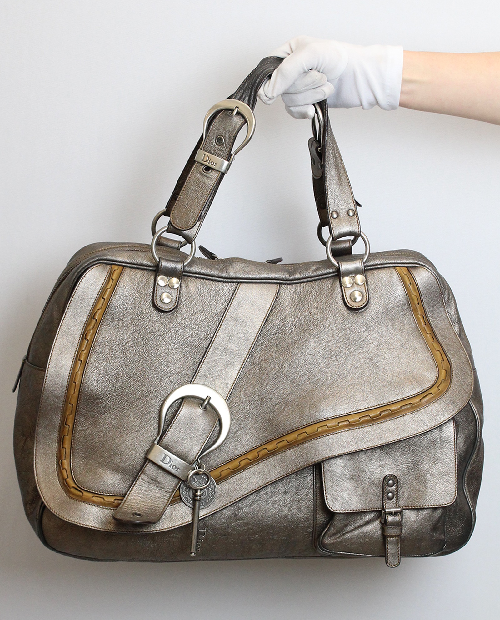 Bolso de la firma francesa Dior, estilo Gaucho, en tono bronce y piel de cordero. Con dos asas, cierre delantero de contacto por imán, con un elemento de decoración y elementos metálicos en tono plata. Para uso cotidiano.Sus medidas son 49x28x15CM.