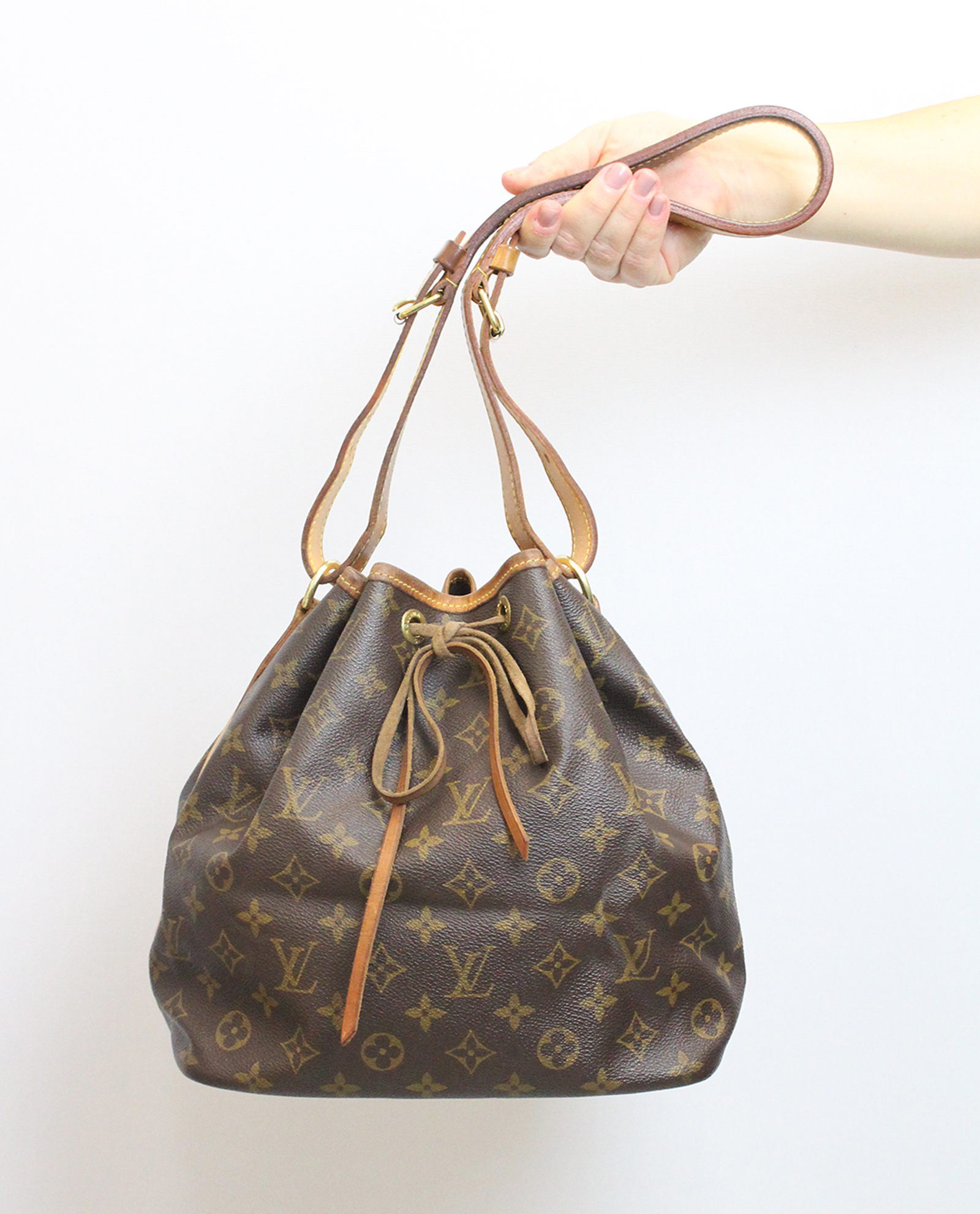 Bolso de la firma francesa, Louis Vuitton, del año 1999, estilo "Noé", en canvas, con estampado en monograma y tamaño mediano. Con cierre ajustable y un asa para llevar al hombro. Piezas metálicas en tono dorado y para uso cotidiano u ocasional.